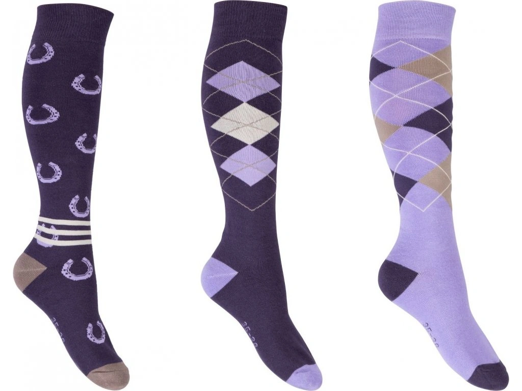 Sada 3 párů jezdeckých podkolenek HKM v různých kombinacích barev a vzorů. Díky vysokému podílu bavlny jsou měkké a velmi pohodlné. Zároveň jsou dobře prodyšné, takže poskytují vysoký komfort při nošení. Lze je prát v pračce na 30°C při jemném pracím cyklu. K dispozici v různých barevných kombinacích.
