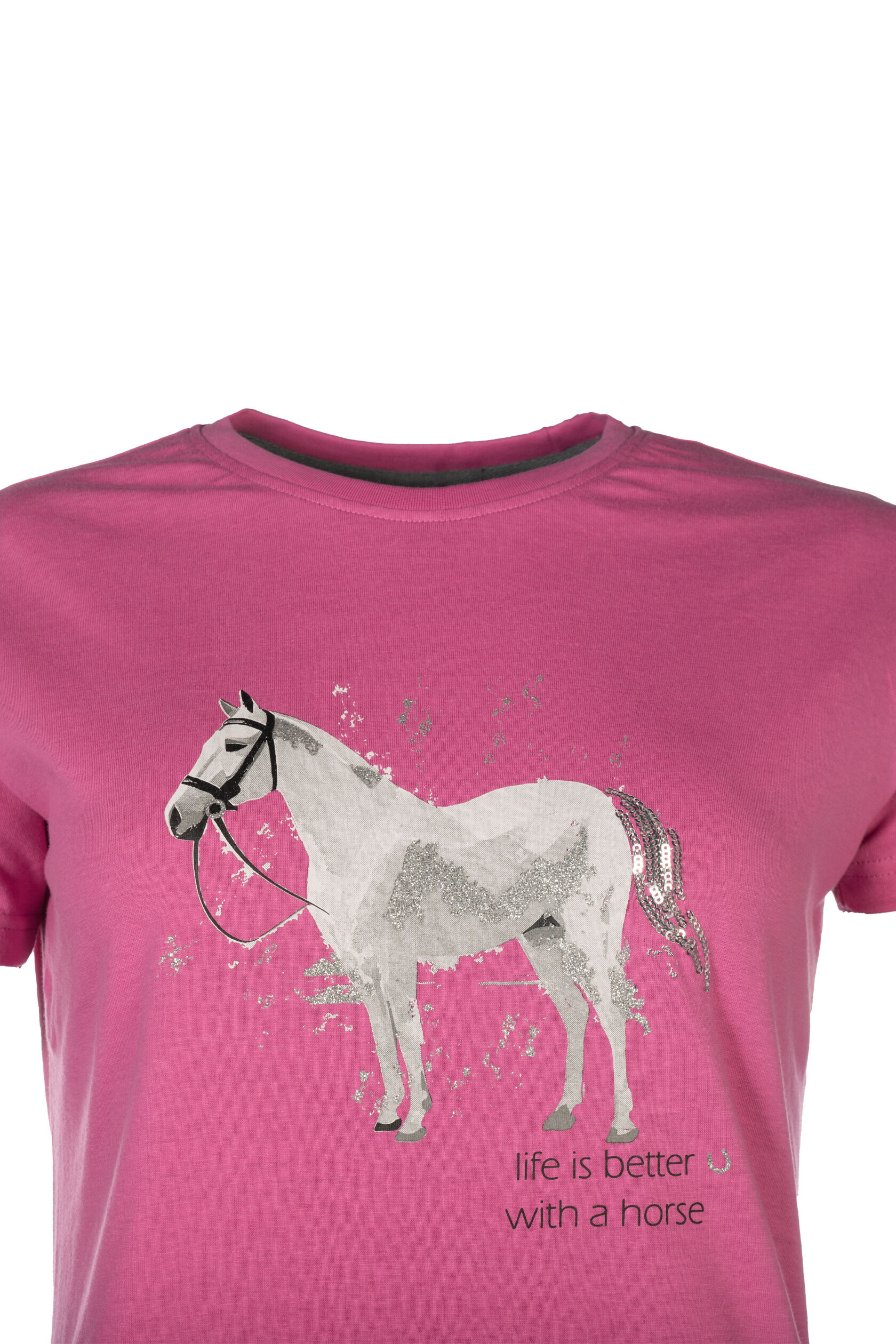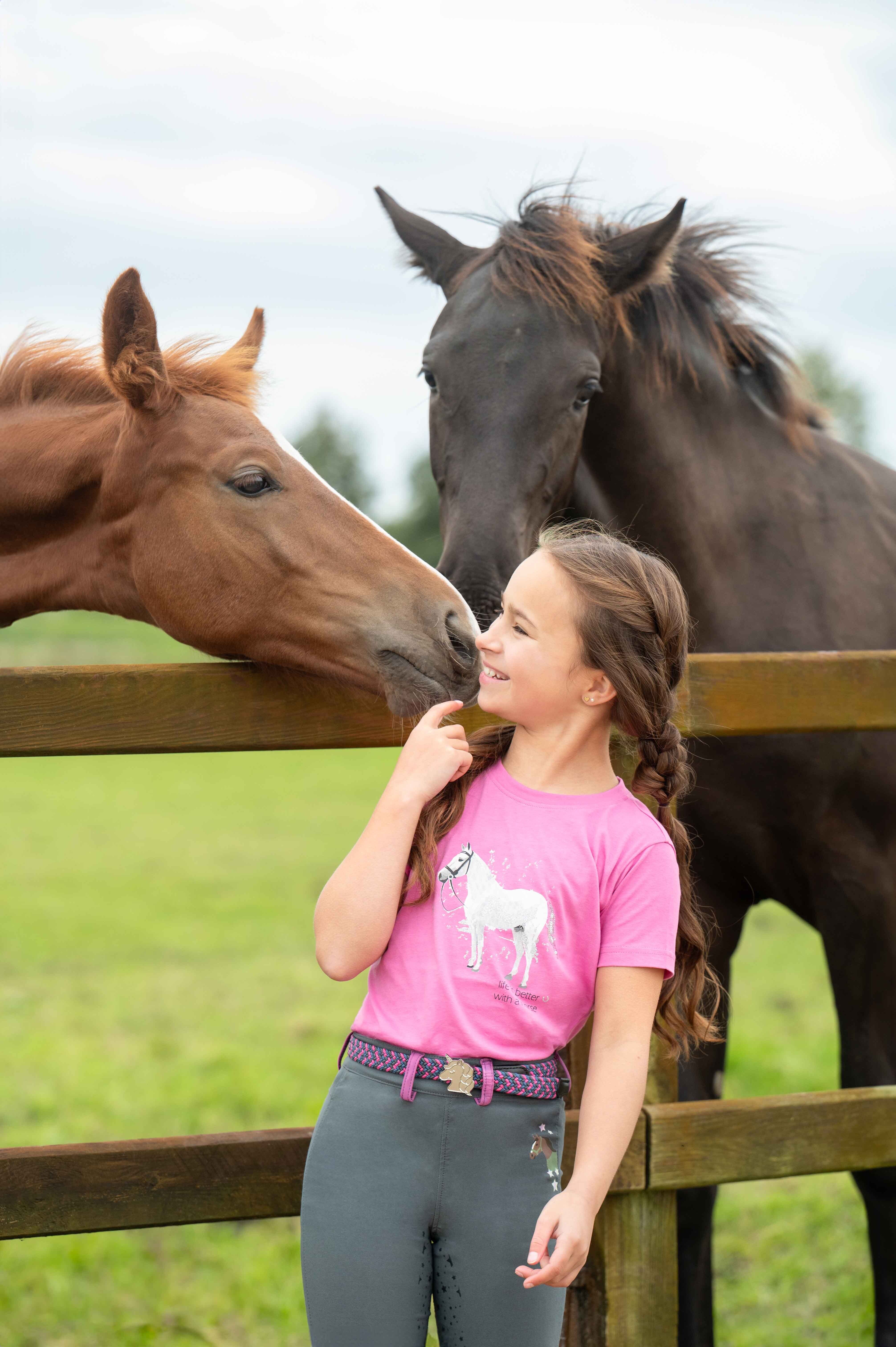 Tričko Sparkle je perfektní top pro malé fanoušky koní! Je vyrobené ze 100% bavlny šetrné k pokožce, je pohodlné na nošení a prodyšné - ideální pro teplé dny ve stáji nebo na hřišti. Vrcholem trička je krásný potisk s motivem koně, který je zdoben třpytivým potiskem a krásnou flitrovou výšivkou. Díky tomu bude každý outfit zajímavý! Ať už na koni, nebo ve volném čase - s tričkem Sparkle mohou děti stylově vyjádřit svou lásku ke koním.