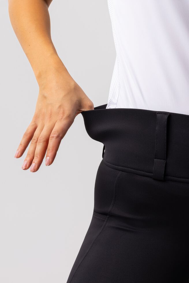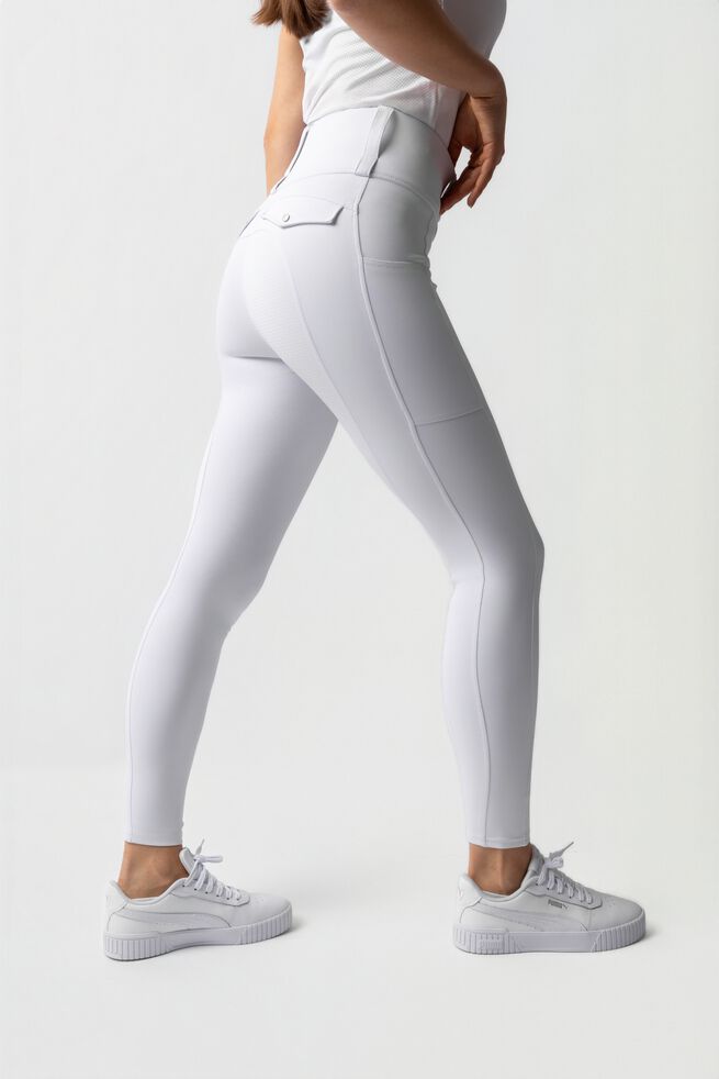Lehké a prodyšné jezdecké legíny s celo gripem, kombinují funkčnost a pohodlí. Vyrobeny z prodyšného funkčního materiálu, který zajišťuje optimální komfort při jízdě. Na stehnech mají speciální kapsy na mobilní telefon, které umožňují snadný přístup i během jízdy. Na zadní straně jsou umístěny ozdobné klopy falešných kapes pro elegantní vzhled. Celogripový silikonový potisk poskytuje vynikající přilnavost v sedle. Kalhoty jsou nenáročné na údržbu a mají praktická poutka na opasek.