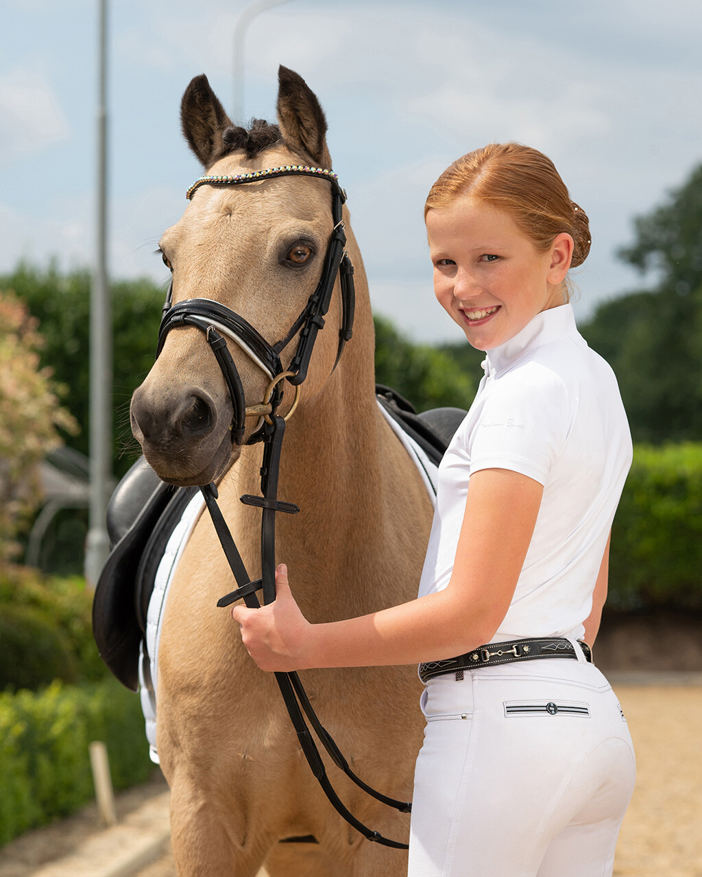Kožený pásek s bílým prošíváním, zdobený kovovým udidlem a kamínky. K dispozici i v hnědém provedení.