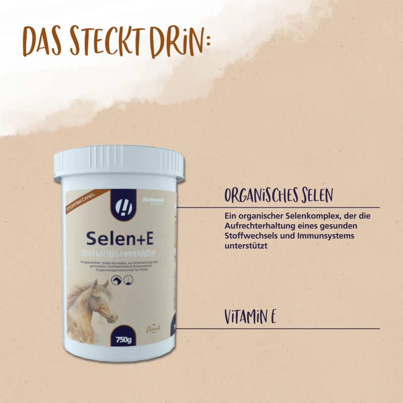 Organický komplex selenu, který podporuje udržení zdravého metabolismu a imunitního systému. Selen + E je krmný doplněk pro koně, který kombinuje vysokou koncentraci selenu s vitamínem E, který podporuje jeho vstřebávání. Je vhodný pro koně, u kterých váš výživář nebo veterinář diagnostikoval nedostatek selenu.