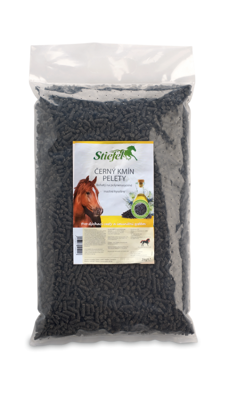 Olejová složka je u produktu Černý kmín pelety díky šetrnému lisování za studena mírně redukována asi o třetinu. Stiefel Černý kmín může podporovat obranyschopnost organismu, kůži a srst i dýchací cesty, je bohatý na vícenásobné nenasycené mastné kyseliny. Použijte i jako podpůrný krmný doplněk pro koně s ekzémem či letní vyrážkou. Peletky koně v krmné dávce dobře přijímají. V nabídce máme také 100% za studena lisovaný olej z černého kmínu.