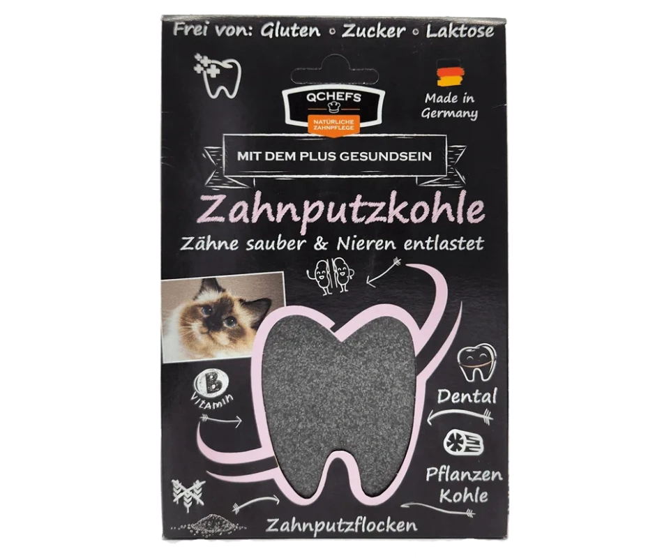 Dentální vločky s BIO aktivním uhlím pro kočky od QCHEFS jsou zdravý přírodní lízací pamlsek pro kočky, který působí proti zápachu z tlamy, tvorbě zubního kamene a přispívá k vyvážené ústní flóře a detoxikaci trávicího traktu. Je vhodný i pro citlivé nebo nemocné mazlíčky.