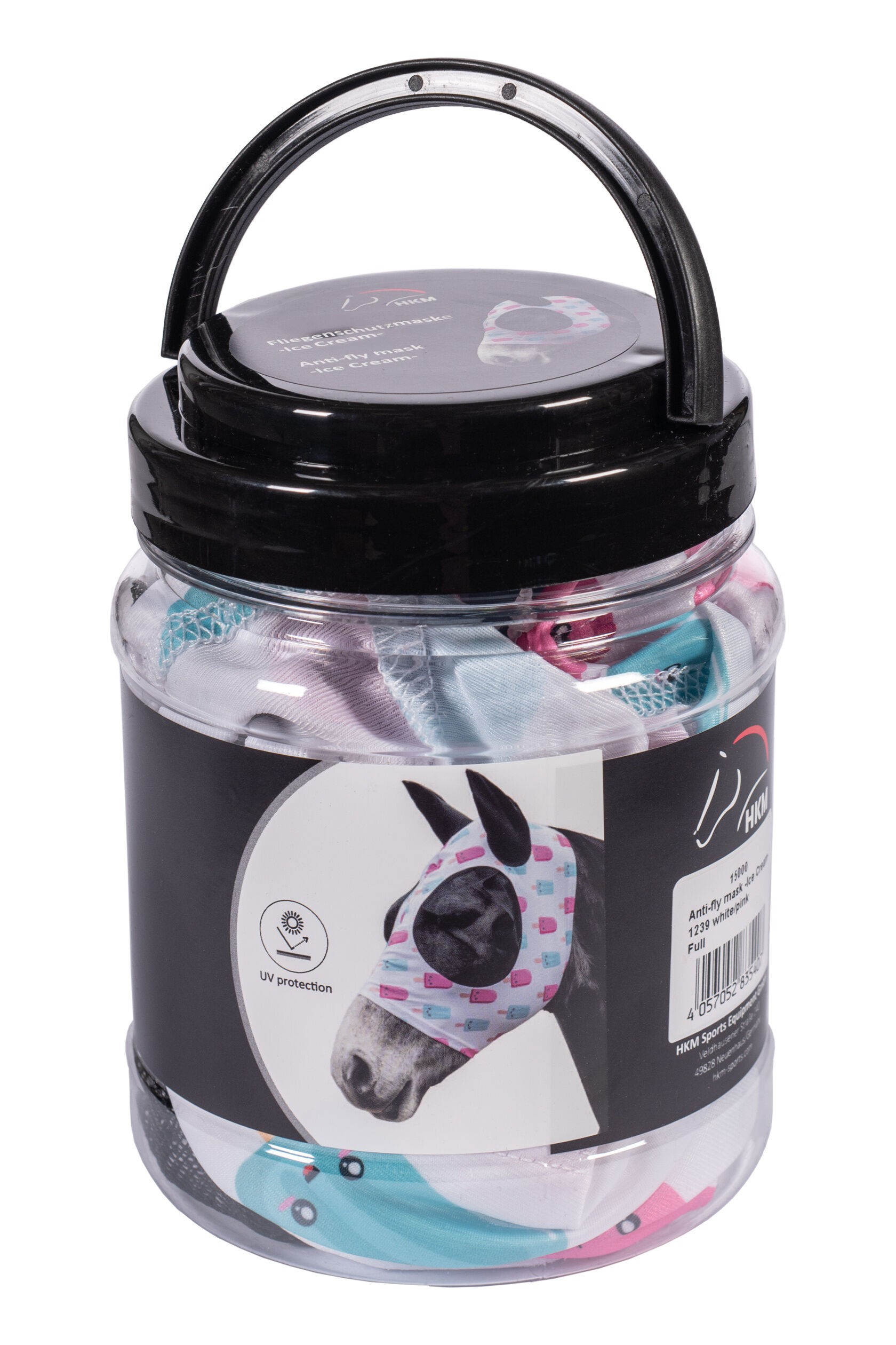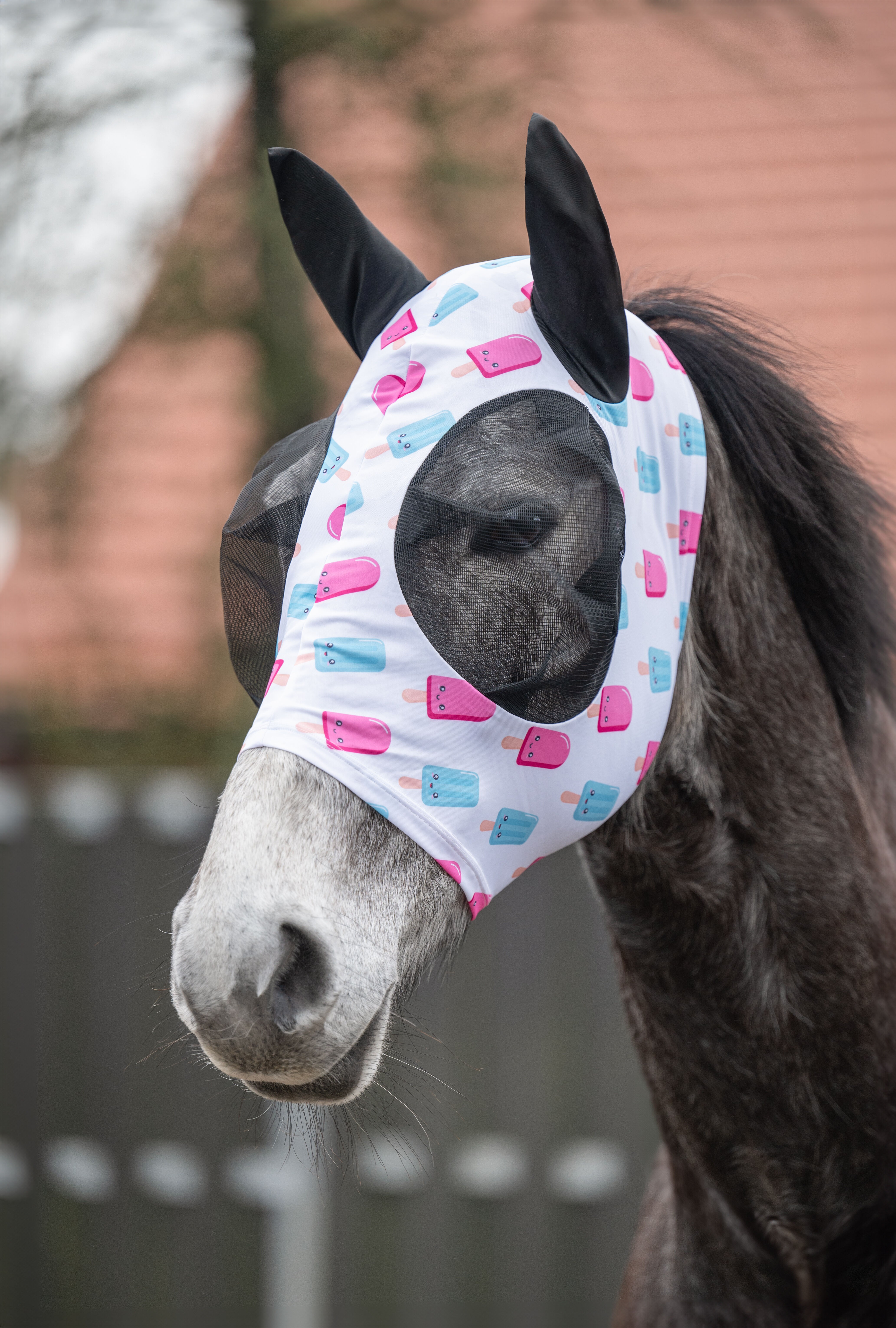 Maska Ice Cream zaujme svým motivem a funkčností. Je vyrobena z elastického strečového materiálu, a proto nevyžaduje zapínání. Maska se jednoduše přetáhne přes hlavu koně. Velká síťovina v okolí očí spolehlivě chrání citlivé oční okolí koně před mouchami a hmyzem. Kromě toho maska proti mouchám nabízí také UV ochranu: ochranný sluneční faktor 50+ nabízí hlavě koně v létě spolehlivou ochranu před UV zářením.