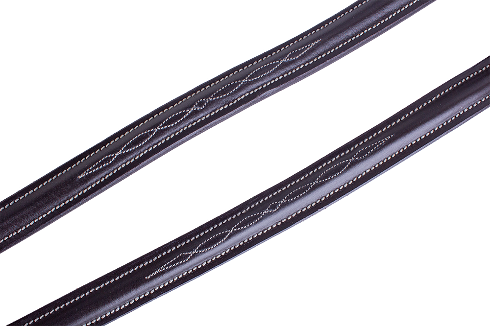 Marrysville ECO. Ekonomické provedení naší oblíbené uzdečky Marysville. Vyrobeno z indické kůže prémiové kvality. Rozšířené upevnění nánosníku zajišťuje jeho stabilnější pozici a rovnoměrné rozložení tlaku. Rozšířený měkce polstrovaný nátylník eliminuje tlak na citlivé oblasti za ušima. Uzdečka je ozdobně kontrastně prošita. Dodáváno včetně plátěných otěží.