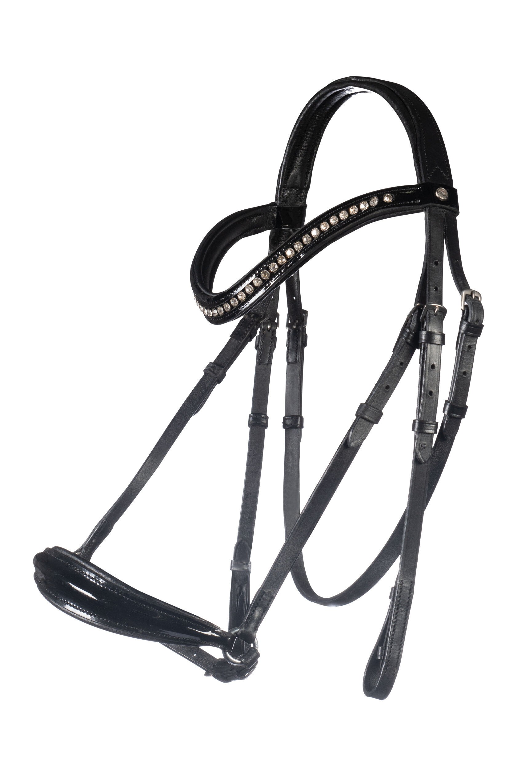 Vysoce kvalitní uzdečka s hannoverským nánosníkem vyrobená z hovězí kůže. Opatřena kováním ve stříbrné barvě. Nánosník, nátylník a čelenka měkce polstrované. Čelenka zdobena lesklými kamínky. Součástí jsou plátěné otěže s koženými zarážkami. Dostupná ve více barvách. Ve velikostech Pony, Cob a Full.