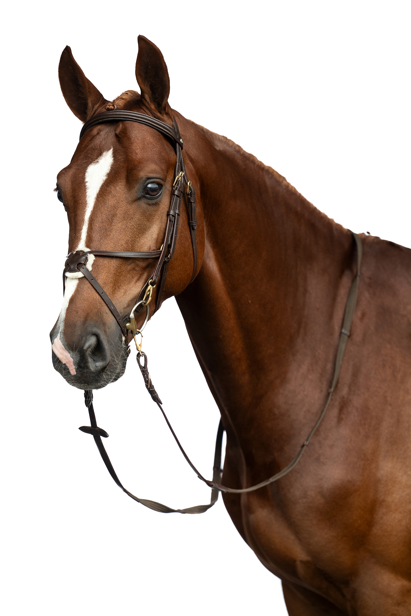 Kožená uzdečka HKM s mexickým nánosníkem, který je podložený beránkem. Otěže jsou z tkaného materiálu a s dvojitými zarážkami.